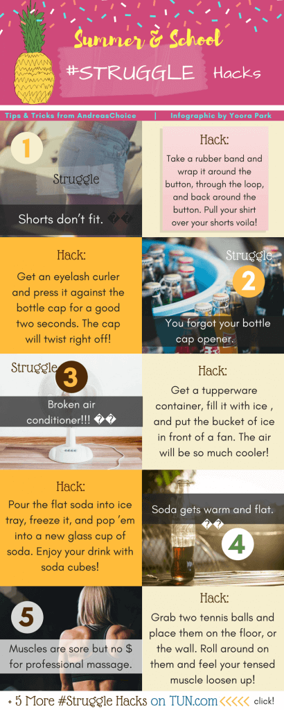 No worries – Youtube star AndreasChoice offers creative solutions to these annoying summer struggles! Make sure to check out her other videos too – she makes D.I.Y, beauty, fashion, and makeup videos, and her videos are always super entertaining and helpful, not to mention that her personality really shines in all of them!