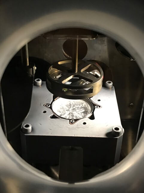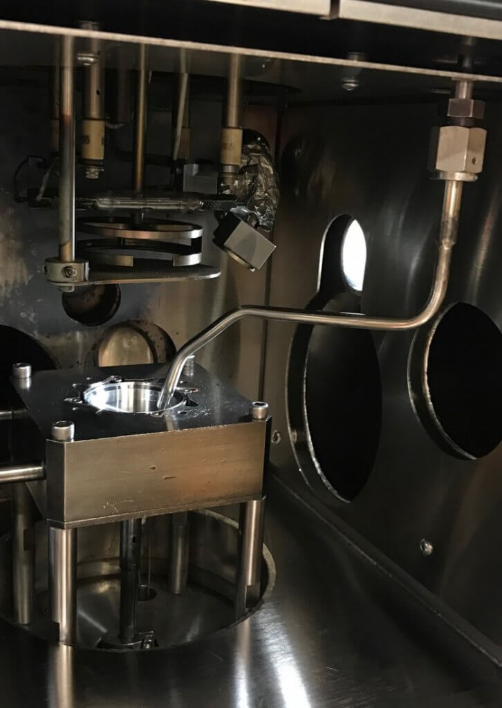 The laser effectively vaporizes the frozen material, which then floats upwards and covers an object hanging above. When the material is gathered at surface, it is blasted with heat. The materials then begin to crystallize and form the thin film.