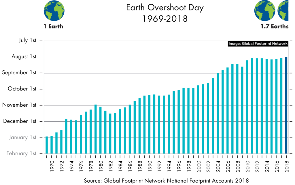 According to Global Footprint Network, humans are using earth’s resources 1.7 times faster than the planet can regenerate. Essentially, in 2018, we are on track to use 1.7 earths.