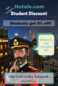 Hotels.com has a special TUN coupon for students. You can now save 8% off select hotels with code TUNSAVE8 when you book by 12/31/17 and travel between 3/31/17 and 1/31/18. Excludes Hilton, IHG, Marriott, Starwood, Millennium & Copthorne, and Emaar.