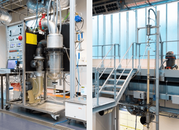 The CO₂ capture device operates using particles called “sorbents.” These sorbents enter the device through an air flow and, once they come into contact with atmospheric gases, bind to carbon dioxide molecules in the air. Then, the sorbents travel up to the top of the absorber column, about six meters tall, before flowing back down through a heated desorber and releasing their CO₂ load. The absorbents then proceed with another cycle of CO₂ collection and release.