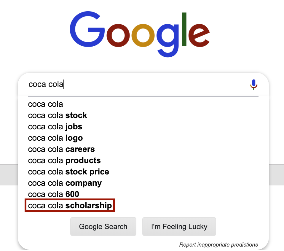 Along the search journey, Google tries to help users by auto-populating the search fields. And if your brand has a scholarship, Google will let users know about it there.