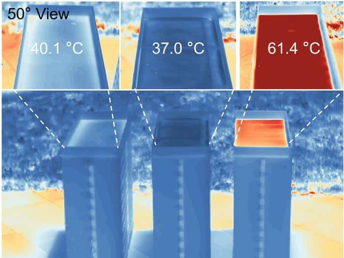 Caption: The middle building is wrapped with the researchers’ meta emitter materials. This structure showed lower temperatures than the other two, which used conventional paint, after sun exposure.