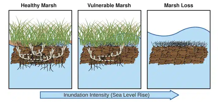 Caption: Declines in belowground biomass can indicate marsh vulnerability to loss. This diagram illustrates how a healthy salt marsh (left) can convert first to a vulnerable marsh (middle) before loss of the vegetated marsh (right) as a result of increased inundation intensity, which is driven by sea-level rise.