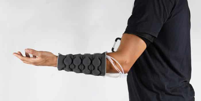 Caption: Haptiknit sleeve worn on the arm, including the control system on the upper arm.